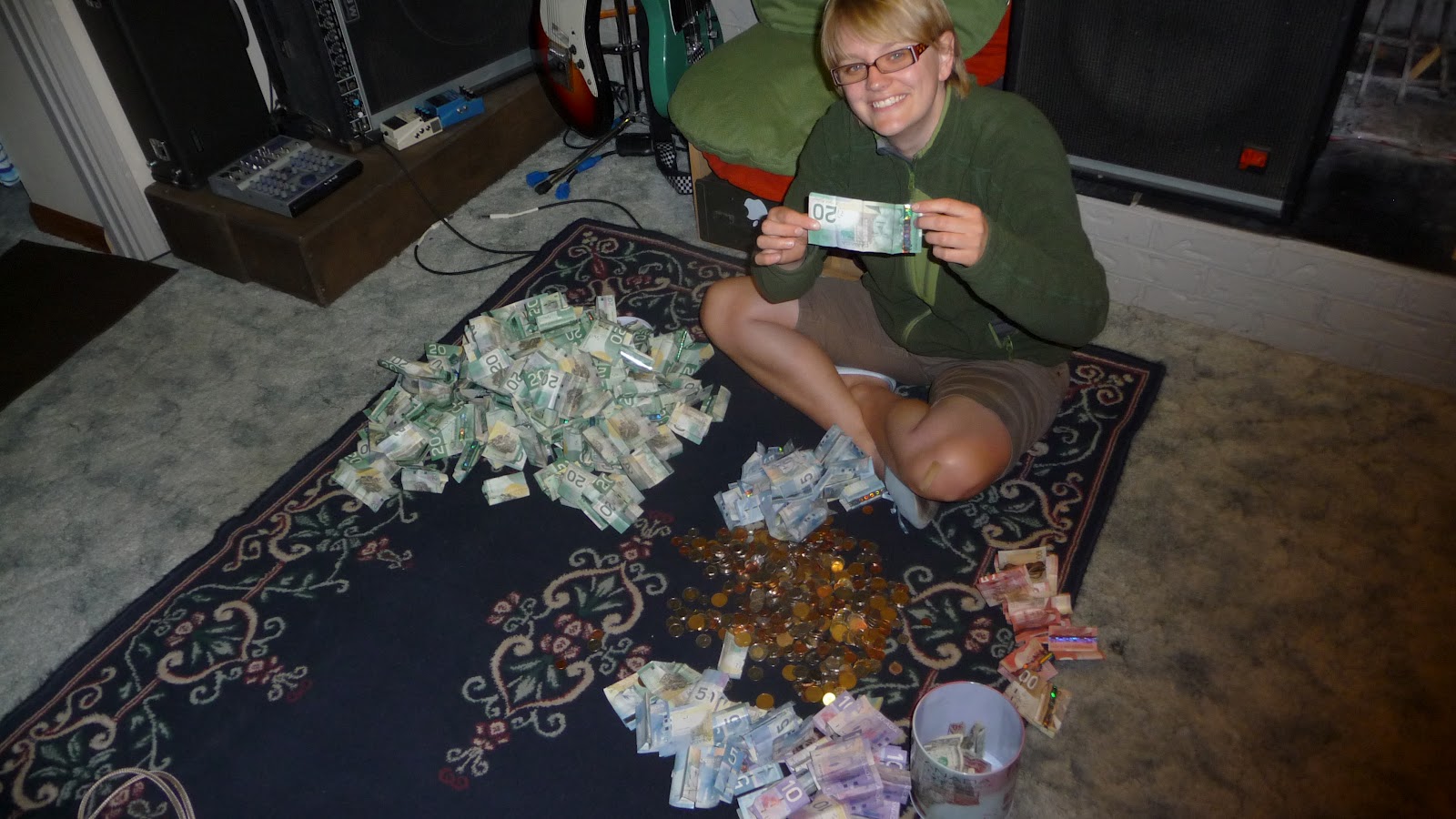 Only 365 days left before we leave Calgary! So far, nobody knows exactly what our intentions are for next year but soon we're going to unveil our plan. Today, Dave and I celebrate the start of the countdown to our departure by breaking into our piggy bank and counting the money: