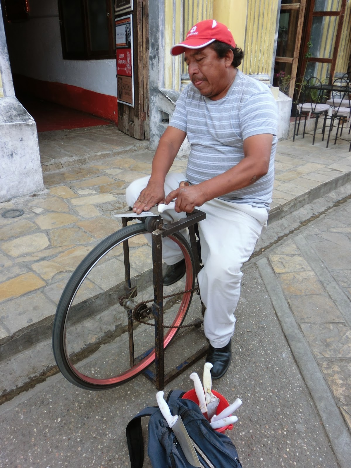 Heute wollten wir eigentlich über die Grenze nach Guatemala, darum stehen wir bereits um sechs Uhr auf. Als wir zur Sammeltaxizentrale kommen, buhlen um die zehn verschiedene Fahrer um unsere Gunst, und zwar laut und gleichzeitig (nur als ich den Fotoapparat zücke, verschwinden sie). Jeder redet den anderen schlecht ("der spinnt / der hat ja gar kein Fahrzeug / der fährt euch nur bis zur Abzweigung und nicht direkt bis zur Fähre / ...") und nennt uns einen anderen Preis. Nach mehrmaligem direktem Nachfragen stellt sich heraus, dass wir in jedem Fall eine unbestimmte Distanz (Nennungen von 1-16 Kilometer Strecke) per Fahrrad zurücklegen müssten und außerdem der nächste Bus mit Dachträger erst in zwei Stunden aufbricht. Aaaaaaah!